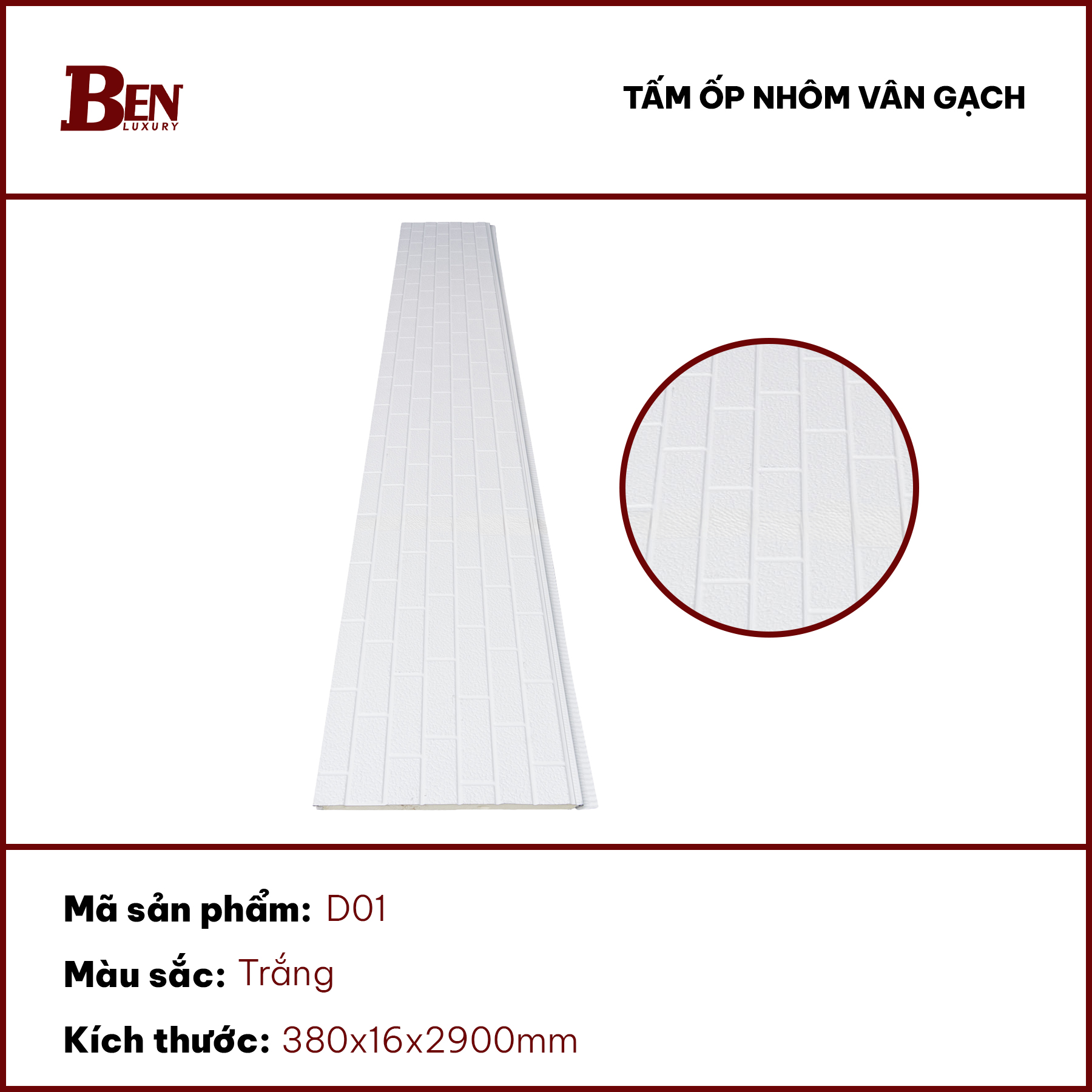 Nếu anh chị thầu, thợ hoặc quý đại lý đang quan tâm đến mã tấm ốp nhôm vân gạch D01 Benluxury và cần bảng thông số kỹ thuật chi tiết hơn cho dự án: